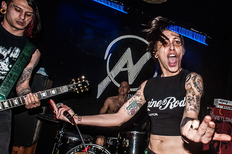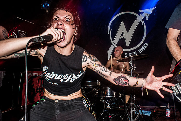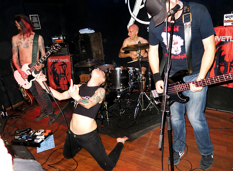 Ein besonderes Powerpack für die Punk- und Hardcore-Freunde des Rhein/Main-Gebiets hielt die Frankfurter Au am gestrigen Samstagabend bereit: Die SVETLANAS mit ihrer russischen Frontfrau Olga (rechts), denen der Ruf der „Most Dangerous Band in the World“ vorauseilt, traten samt den Support-Acts von TONY GORILLA aus NRW und den lokalen RITUAL INSULTS an, um die gut besuchten Räumlichkeiten des kleinen Rödelheimer Kellerclubs in eine schwitzige Sauna zu verwandeln. Und in der Tat, es sollte heiß hergehen…