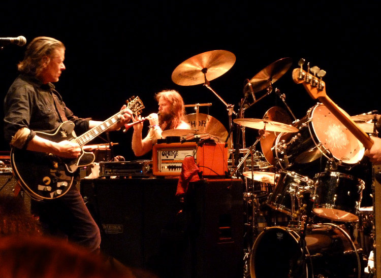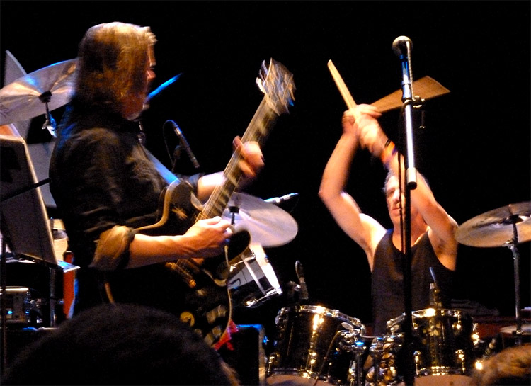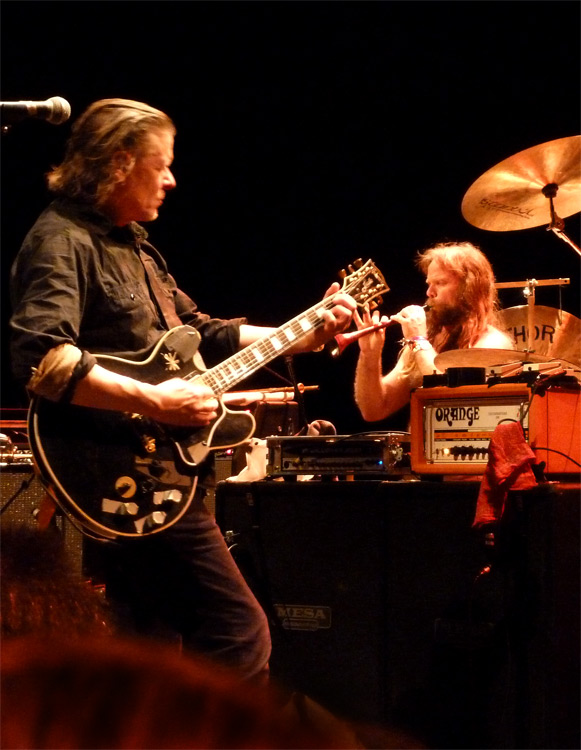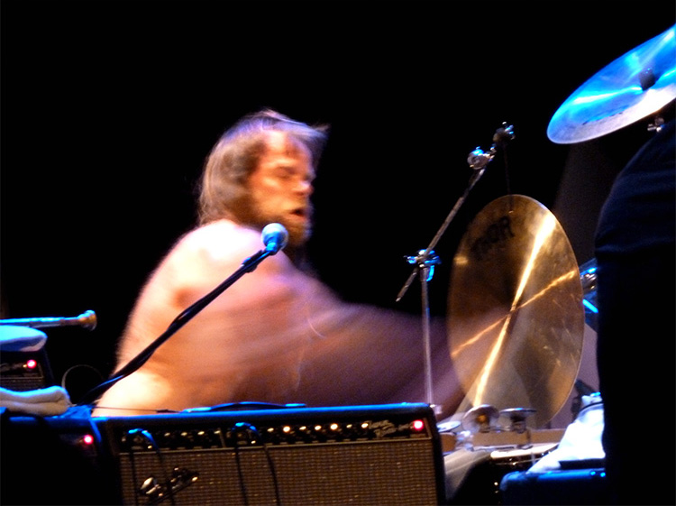 Für den SWANS-Auftritt präsentierte sich das flexible Interieur des großen Saals mit seiner größten möglichen Fläche. Soll heißen, der Balkon war geschlossen und die großflächigen Treppen-Ebenen waren eingefahren. Und obgleich die Location nicht ganz gefüllt war, so war die Stimmung doch gut und der Einmarsch der New Yorker wurde von tosendem Applaus begleitet. Gira nahm mit seiner Gitarre den Platz in der Mitte der Bühne ein, hinter ihm tobten Schlagzeuger Phil Puelo und Percussionist Thor Harris (Foto unten), zu seiner Linken