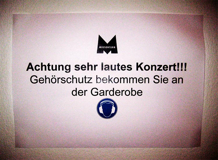 Die nachfolgende Pause nutzte ich zu einem Abstecher an den Bierstand, an dem lächerlich kleine Plastik-Becher ausgegeben wurden (ich kenne Kneipen, in denen man aus solchen Gläsern Schnaps trinkt), von denen auch noch jeder zweite undicht war. Dies bot im grellen und ziemlich ungemütlichen Foyer des Mousonturms ein lustiges Bild, da viele Besucher damit beschäftigt waren, die Lecks ihrer Becher abzudichten. Ebenfalls im Foyer fielen Hinweisschilder auf, die vor einem „sehr“ lauten Konzert warnten und auf einen an der Garderobe erhältlichen Gehörschutz verwiesen. Die brachiale Lautstärke ist eines der Charakteristika eines SWANS-Gigs, Warnschilder dazu hatte ich allerdings noch nie gesehen.