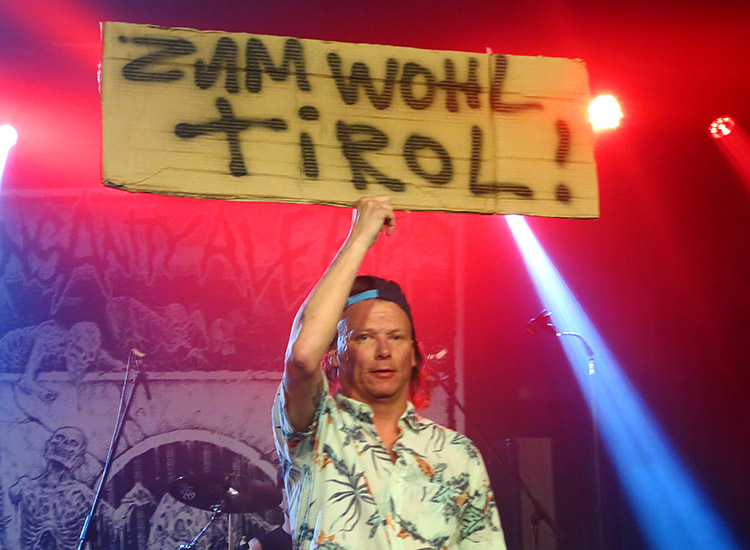 hielt ein ums andere mal obskure Motto-Schilder („Zum Wohl Tirol!“) in die Höhe und tauchte zuletzt mit einer Luftmatratze in Form eines Bierglases auf, die dem entfesselten Publikum nachfolgend als Surfbrett diente. Hier stand ganz in der Tradition von TANKARD oder GANG GREEN der Fun-Aspekt im Mittelpunkt: Textlich ging‘s ums Saufen – das neue Album heißt „666-Pack“ –, ums Kiffen und ums Partyfeiern. Am Ende der Show gab‘s auch diesmal wieder den umgetexteten IRON-MAIDEN-Hit „Run to the Pit, Mosh for your Life!“. Einmal mehr ein Hammer-Auftritt von einer der größten Party-Bands unserer Zeit, die für uns der eigentliche Headliner des Tages waren.