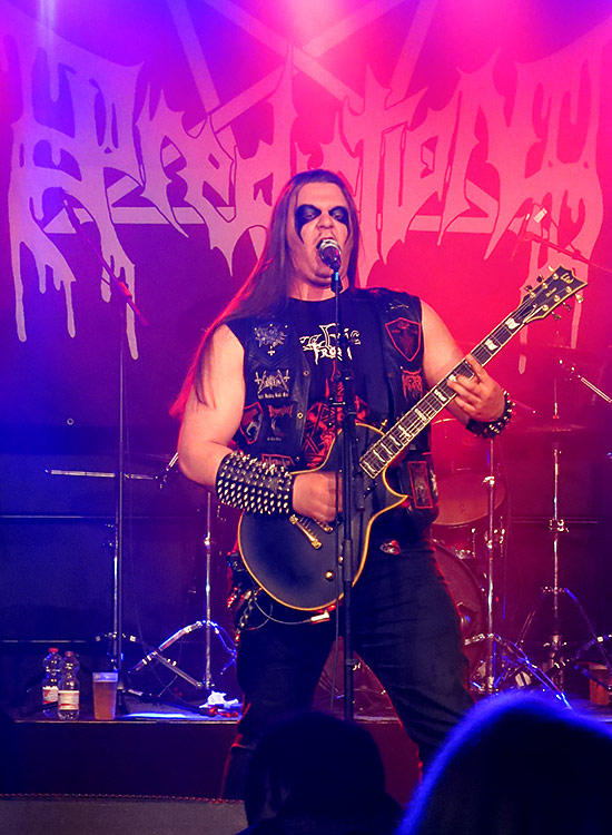 klassischem Oldschool-Black Metal der Marke CELTIC FROST und Death Thrash geboten, die zur späten Stunde und zum Ausklang des Tages perfekt passte. Die finsteren, druckvollen und einfach strukturierten Songs bohrten sich wie ein Metallfräse in die Gehörgänge des Publikums und machten dieses ein letztes Mal am Abend zu willenlosen, headbangenden Duracell-Hasen. Dabei stellten