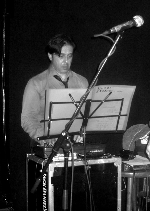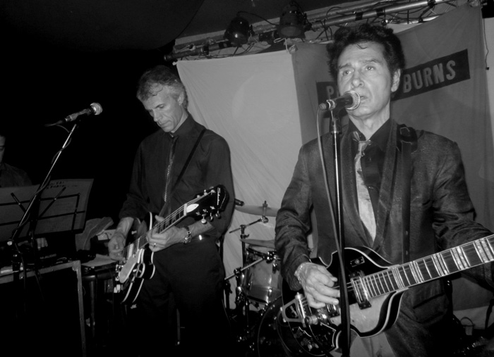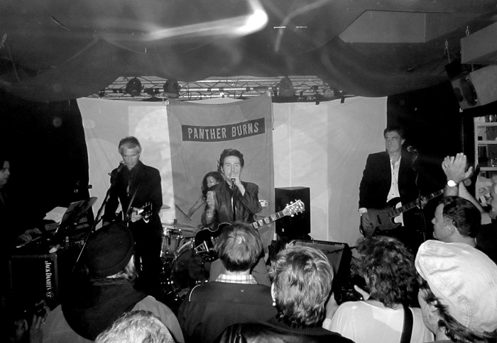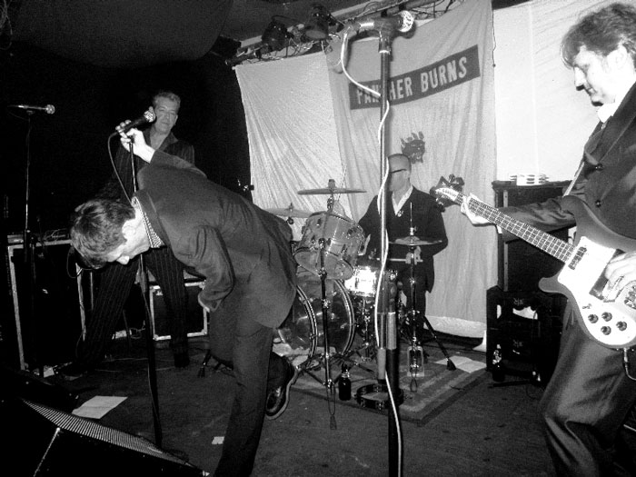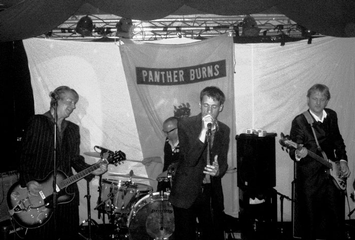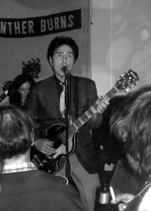 Zu Beginn verbrachte er die Pausen eigentlich nur mit erwähntem Stimmen, kämmte sich sein Haar oder ging mal schnell in den Backstageraum nebenan, um sich ein Schlückchen zu gönnen. Das alles mit sehr ernster Miene. Aber nach etwa einer Stunde huschte dann schon einmal ein Lächeln über sein Gesicht, und er gab ein paar Anekdoten preis. Zum Beispiel anlässlich seines Covers von „Love Is My Business“ (zu finden auf der „Blow Your Top“-EP – empfehlenswert), zu dessen Originalinterpreten CLIFF GLEAVES, auch aus Memphis und Mitglied der Memphis Mafia, wie er uns erzählte.Dass sich die PANTHER BURNS im Großen und Ganzen live recht professionell für ihre Verhältnisse anhören, liegt bestimmt auch daran, dass sie in der jetzigen Besetzung schon einige Jahre zusammen spielen. TAV FALCO, mittlerweile in Paris ansässig, wird an Bass und Gitarre von zwei Franzosen unterstützt, während die Schlagzeugerin und der Keyboarder aus Italien kommen. Bei dem Keyboard handelt es sich um ein elektrisches Mini-Klavier, vielleicht einen halben Meter breit, nicht mehr. Nichts für Puristen, passte aber gut. Besonders bei den paar Tangostücken, zu denen Tav eigentlich noch einen angeblich extra mitgebrachten Tangotänzer auf die Bühne holen wollte, darauf aber verzichtete, weil diese zu eng war. Keine Ahnung, ob’s stimmt. Die Tangos kamen gut an, wie auch der Klassiker „Brazil“, der absolute Hammer war aber meiner Meinung nach