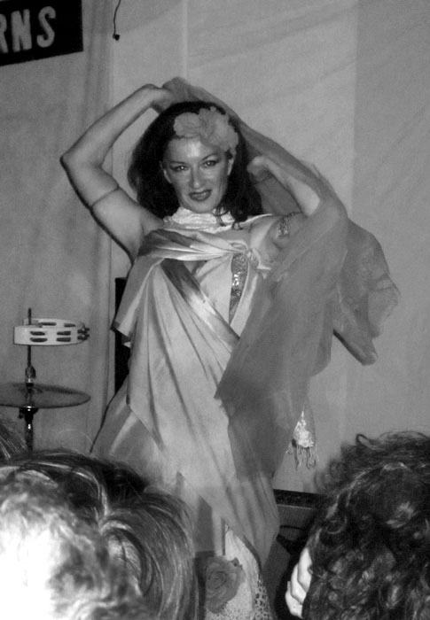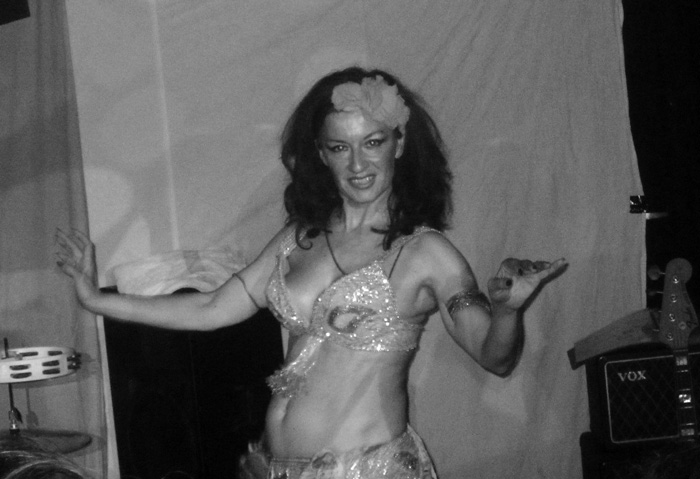 Aber ein bisschen schräg passt zu den PANTHER BURNS und TAV FALCO’S Stimme und hält sie nicht vom Rocken ab. Das taten sie von elf bis halb zwei! Allerdings rissen sie mich nicht von Beginn an vom Hocker. Die ersten drei Lieder waren alle Cover: „Tiger Man“, „Funnel of Love“ und „Tobacco Road“. Vor allem beim letzten fing ich an zu zweifeln, ob das noch mehr als eine Tanzband auf einer Hochzeit sei. Dabei schien der Rest des Publikums meine Zweifel nicht zu teilen, der begeistert schrie und tanzte. Das mochte daran liegen, dass die Leute nicht nur vom Set der Vorband heiß waren, sondern auch vom Schleiertanz, den die Schlagzeugerin der PANTHER BURNS, Giovanna, eingangs einlegte, bevor sie dann knapp bekleidet hinter der Schießbude Platz nahm (siehe den Clip unten). Aber wie gesagt, der Eindruck von der Hochzeitsband änderte sich bei mir schnell.