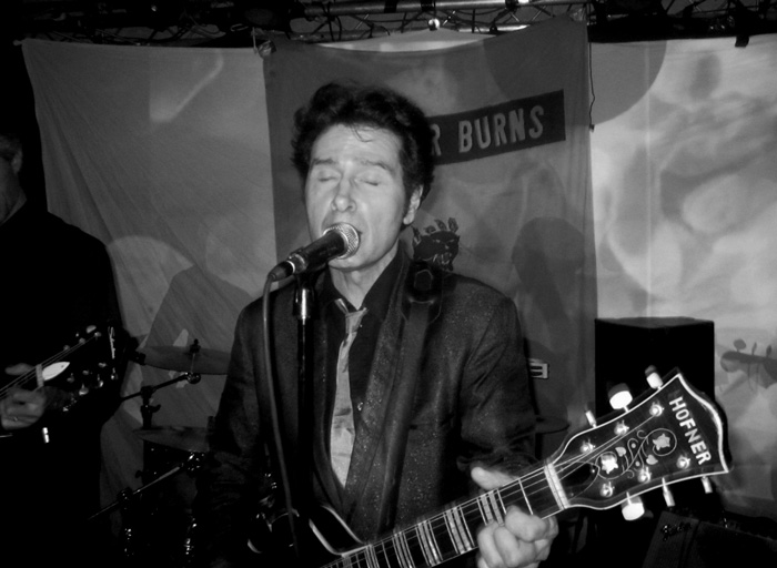rock’n‘rolliger. Das Publikum im recht gut gefüllten Ponyhof trug zur gesteigerten Stimmung bei. Doch wenn man an der Bar zu viel Gas gibt, wird man nach ein paar Drinks schon mal melancholisch. Dazu passten die country-lastigen Balladen mit einer schön twangigen Gitarre, die die vier Herren während der zweiten Hälfte des Sets anstimmten. Am Ende wurde es noch mal rockiger, aber wie sie selbst sagten, waren sie „ja nur die Vorband“ und räumten die Bühne für TAV FALCO (oder Gustav, wie sie ihn nannten). Prost, Kings! Hat mir gefallen, schön auch die Verwendung eines halb gefüllten Gerippten zum Slide-Gitarre-Spielen.Als TAV FALCO noch in Amerika wohnte, war er einer der Hauptakteure der Underground-Szene in Memphis, und er hat für mich eine ähnliche kulturelle Bedeutung wie ALEX CHILTON oder JEFFREY LEE PIERCE. Allerdings mag er es auch kitschiger und setzt neben obskurem Rockabilly und Garage- Psych zusätzlich auf Tango und Balladen. Und vor allem mag er es sloppy-chaotisch-unprofessionell. Wer das Debütalbum „Behind the Magnolia Curtain“ kennt, der weiß, was ich meine. Es gibt durchaus auch eher professionell eingespielte Aufnahmen der PANTHER BURNS, aber Perfektionisten sind sie nicht. Das waren sie auch nicht gestern, die Instrumente wurden oft gestimmt, was meistens halbwegs hinhaute. Irgendwann gab Gustavo dann aber auf: „I’m not gonna tune this thing!“.