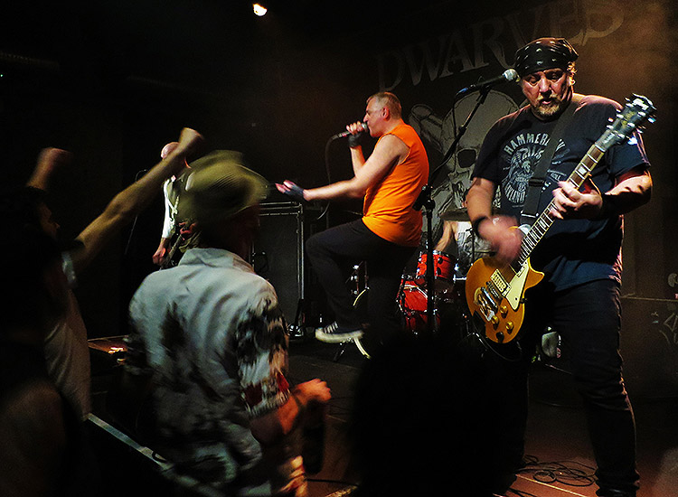 Nach einer etwas längeren Pause – die gleichen Musiker mussten schließlich noch mal ran – standen dann endlich die DWARVES auf der Bühne, die in der nächsten knappen Stunde ein Feuerwerk ihrer größten Hits abbrennen sollten, das keine Wünsche offen ließ. Die Zusammenstellung der Setlist dürfte den Amerikanern nicht leicht gefallen sein, denn seit Mitte der 1980er Jahre sind gut ein Dutzend Alben und knapp 40 Singles und EPs erschienen, die ausreichend Material bieten. Und auch wenn die Jungs live mittlerweile weniger gewalttätig agieren, so ist das inhaltliche Konzept bis heute gleich geblieben: Es geht um Sex‘n‘Drugs & Rock‘n‘Roll, nahezu jedes Plattencover wird von einer nackten Frau geziert und Songs wie „Let‘s fuck“, „Sluts of the USA“ und „We Only Come