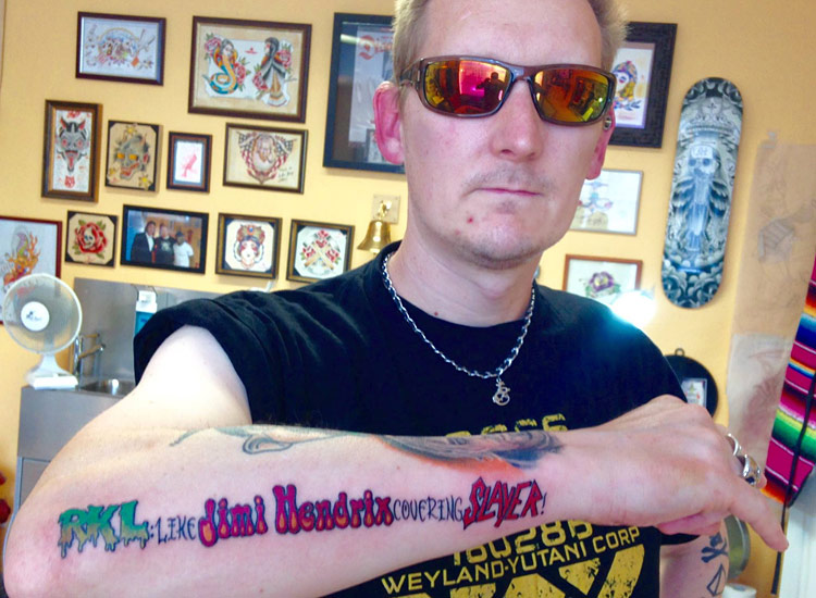 links: Christian, Betreiber einer RICH KIDS ON LSD-Tribute-Website, zeigt sein Tattoo mit dem Schriftzug „RKL like Jimi Hendrix covering SLAYER“, 2015. Foto: Christian Oner