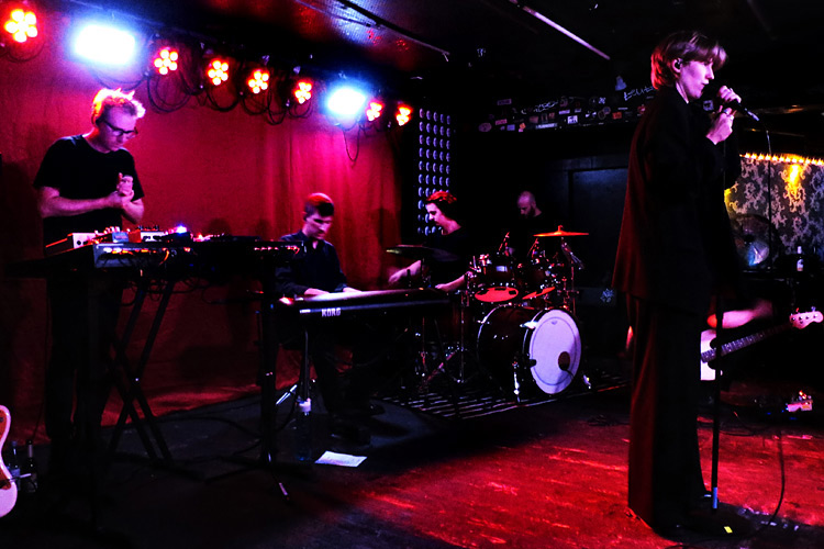 folgenden 70 Minuten des Konzerts Bestand hatte und im Anschluss zu diversen ausgelassenen Gruppen-Selfies führte. Mangels einer Vorband mussten alle Gäste 30 Minuten länger bis zum Beginn der Show warten – ein guter Tausch, wenn man Teil einer solchen Einheit war. Gegen 20.30 Uhr erschienen die vier Männer der Formation, allesamt in existentialistischem Schwarz, aber nicht uniform gekleidet – gefolgt von der Sängerin und Co-Autorin der Songs, Fenne Kuppens, neben einem Mann, der fortan mit verschränktem Arm vor dem Eingang des Backstagebereichs die Performance und das Publikum intensiv beobachtete. Auch diese beiden unterschieden sich in der Wahl der Garderobe farblich nicht von ihren Kollegen.