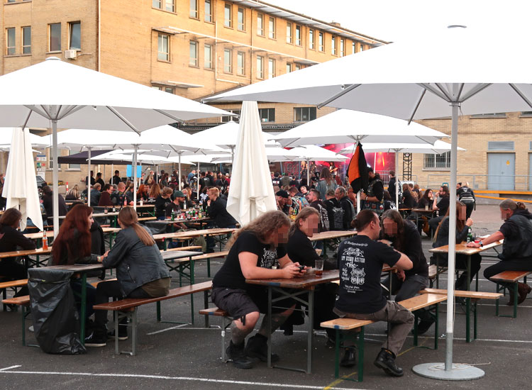 verhindern sollte, dass die Besucher allzu gedrängt aufeinander hockten. Die Karten waren schnell weg, sodass recht bald „Sold Out“ vermeldet werden konnte. Auch der Wettergott meinte es gut mit der Metal-Gemeinde, am ersten Tag des Festivals herrschte strahlender Sonnenschein.