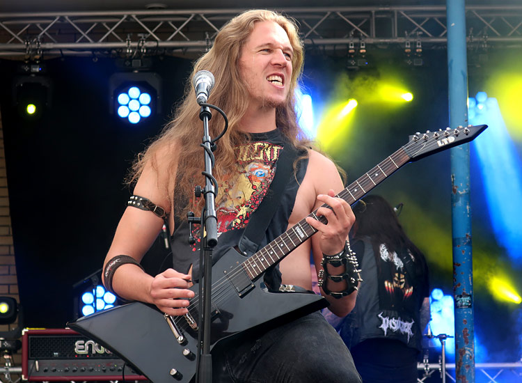 Los ging’s jeweils um 15 Uhr und für mich leider zu früh, sodass ich den Auftritt der Frankfurter LAWMÄNNER verpasste. Als ersten Act sah ich die aus dem Taunus stammenden INSULTER, die beim Taunus Metal Festival mittlerweile eine Institution darstellen – wir berichteten bereits 2016 und 2019 über die Jungs aus Friedrichsdorf. Seit einigen Jahren vom