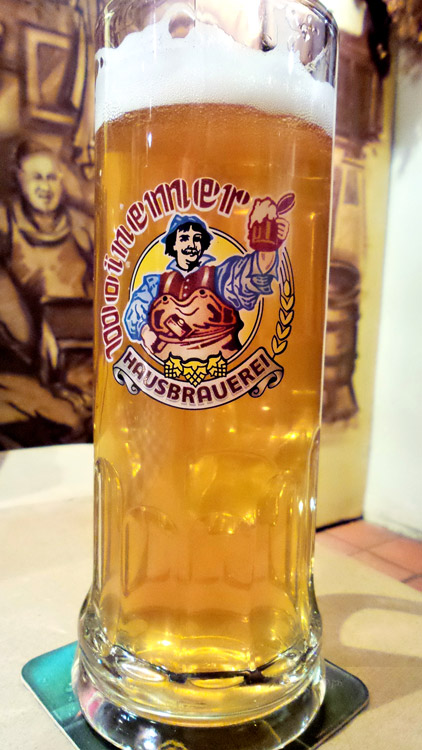 Meine findige Begleiterin hatte vor dem Konzert einen Tisch bestellt in einem Etablissement, das einen Häuserblock vom Café entfernt eigenes Bier braut. Ein Bier, welches man in Weinheim wohl an jeder Ecke (später auch im Café) bekommt, von uns Zugereisten aber probiert werden musste. Ein Test, der den ganzen Abend lang wiederholt wurde und letztlich zu dem Ergebnis führte, dass Weinheim einfach zu weit entfernt liegt. Feinster Stoff, sehr zu empfehlen.