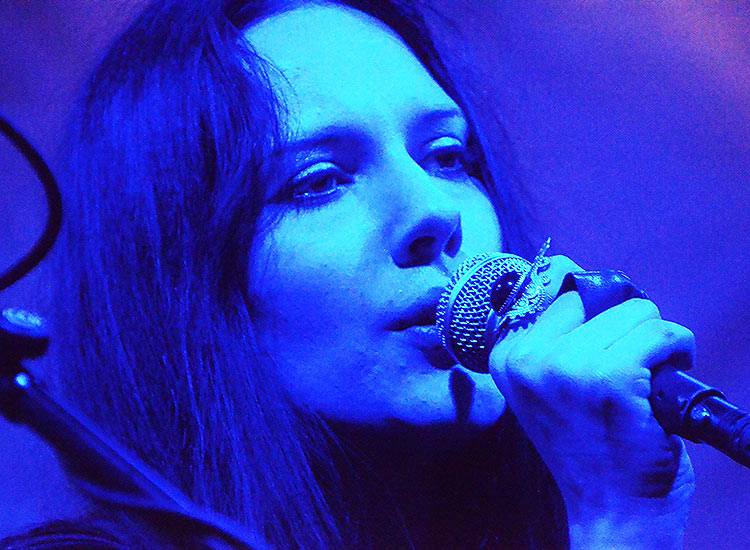 Eingezwängt zwischen zwei Türmen in Menschengestalt, von denen einer auch noch an Flatulenz litt, musste ich zeitweise richtig leiden um eine Blick auf die Akteure, vor allem auf die zauberhafte Heike Langhans, zu ergattern. Die stammt aus Südafrika, spielte dort bereits in Symphonic- bzw. Black Metal-Bands und ist in der schwarzen Szene durch ihr Elektroprojekt