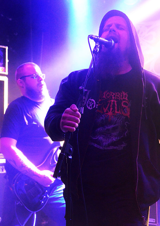 Ex-GRIFTEGARD) begrüßte die Unwissenden mit dem Zeichen seines Herrn (Pommesgabel), wurde dafür aber nur resonanzlos angeglotzt. Das waren halt noch keine Jünger, sondern eher interessierte Novizen, die sich wegen der Headliner eingefunden hatten. Außer mir. Ich teile allerdings nur die Liebe zu den Klängen und nicht den Glauben, und zum substanzlosen Zurückgabeln war ich nicht betrunken genug. Sorry.